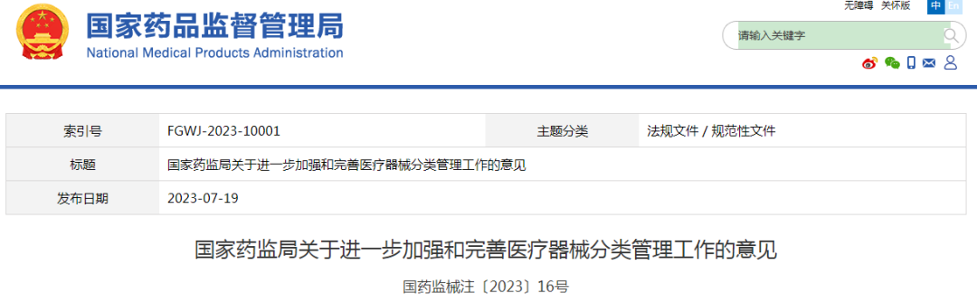 分类管理是医疗器械监管的重要基础性制度。近年来,我国医疗器械分类管理改革持续推进,管理制度与运行机制不断完善,分类规则与分类目录适时修订,监管效能和产业发展得到有力提升。随着医疗器械相关科技和产业高速发展,医疗器械监管工作面临新形势新任务新要求,分类管理工作流程有待进一步优化,支撑能力有待进一步提升,分类管理制度执行有待进一步严格。为贯彻《国务院办公厅关于全面加强药品监管能力建设的实施意见》(国办发〔2021〕16号),落实深化医疗器械审评审批制度改革有关要求,现就进一步加强和完善医疗器械分类管理工作提出以下意见:以习近平新时代中国特色社会主义思想为指导,贯彻《医疗器械监督管理条例》,落实“四个最严”要求,立足我国实际,借鉴国际经验,优化管理体系,健全管理制度,强化支撑能力,提高质量效率,进一步提升医疗器械分类管理工作的科学化、法治化、国际化、现代化水平,有力助推产业高质量发展,更好地保护和促进公众健康。1.明晰各方工作职责。国家药监局负责制定医疗器械分类规则和分类目录,根据医疗器械生产、经营、使用情况,及时对医疗器械的风险变化进行分析、评价,对分类规则和分类目录进行动态调整并监督实施。省级药品监督管理部门负责监督实施医疗器械分类管理制度。医疗器械分类技术委员会在国家药监局领导下开展医疗器械分类及相关技术研究工作,为医疗器械分类管理工作提供技术支撑。2.加强分类技术委员会管理。明晰医疗器械分类技术委员会执行委员会、专业组和秘书处职责要求,完善运行机制,强化委员管理,完善委员、专业组考核评价机制,探索建立激励约束机制,持续加大委员培训力度,强化分类技术委员会的技术支撑作用,促进分类管理有效服务监管。3.细化分类原则要求。完善由分类规则、分类界定指导原则、分类目录组成的分类管理制度体系。研究修订《医疗器械分类规则》,为有序调整产品类别奠定基础。针对新材料、高新技术等领域,聚焦监管热点问题、共性问题和急需问题,在分类规则框架下研究细化分类界定指导原则,统一相关领域产品分类界定原则和尺度,服务产业高质量发展。4.修订完善分类目录。依据《体外诊断试剂分类规则》,修订体外诊断试剂分类目录,完善分类框架,细化分类层级,规范预期用途,扩充代表性产品,扩大目录覆盖面。完善《医疗器械分类目录》《第一类医疗器械产品目录》,强化产品分类与通用名称命名有机衔接,建立医疗器械分类命名数据库,保障分类及命名规则有效实施。5.优化分类界定工作程序。规范医疗器械产品分类界定工作,细化职责分工,进一步优化工作流程。完善分类界定申请资料要求和审查要点,畅通申请人沟通渠道,明确工作时限要求。对于突发公共卫生事件、监管急需的相关产品,快速研究、界定产品属性和管理类别。针对稽查办案、信访举报等情形设置分类界定特殊程序。6.落实分类目录动态调整制度。鼓励医疗器械注册人/备案人、经营和使用单位、监管部门、协会学会等,按照《医疗器械分类目录动态调整工作程序》提出分类目录动态调整建议。综合考虑产品风险变化和审评审批能力、上市后监管等全生命周期监管工作需要,科学、合理、有序地调整医疗器械产品管理类别,优化监管资源配置,释放产业活力,有效管控产品风险。7.强化分类技术研究。紧盯国际前沿技术发展,重点关注产业创新发展的“卡脖子”问题,加强新兴技术领域分类管理政策的前瞻性研究,有针对性地开展分类管理相关课题研究,就分类管理涉及的热点、难点问题和共性问题及时研究并发布解读,进一步强化相关领域医疗器械分类工作指导。8.加强分类工作调研。强化分类相关工作调研,针对调研中发现的问题,及时研究制定科学合理的解决措施,提升分类管理工作效能。充分发挥协会学会作用,及时收集业界关注,分析研判、组织研究、明确意见,提高分类工作的主动性。9.加大分类培训宣贯。充分发挥分类技术委员会专业优势,定期开展分类规则、分类界定指导原则、分类目录等相关制度和政策、文件的宣贯培训,丰富培训形式、拓宽培训渠道,突出培训的针对性和实操性,进一步提升各有关方面对分类工作的认知能力和水平。10.加强分类界定信息化建设。进一步加强医疗器械分类界定信息系统功能建设,优化医疗器械分类界定在线申请和信息查询方式等工作流程,不断提升在线申请工作的规范化和便利化水平,建立医疗器械分类数据共享的协调机制,推进分类信息资源共享。11.强化分类界定信息公开。严格落实分类界定信息公开机制,主动公开分类相关政策文件、分类目录及动态调整信息,做好分类相关政策文件解读,及时公开分类界定信息,确保分类界定工作公正透明。12.落实主体责任。根据产品注册备案需要,申请人可依程序提出分类界定申请。申请人应当落实主体责任,规范提交分类界定申请资料,并确保资料的合法、真实、准确、完整和可追溯。原则上产品注册申报/备案资料有关内容应当与分类界定申请资料有关内容保持一致。注册人、备案人及相关企业应当加强分类相关知识学习,密切关注产品管理类别调整情况,确保注册、备案及生产、经营等行为符合医疗器械分类及监管有关要求。13.强化监管责任